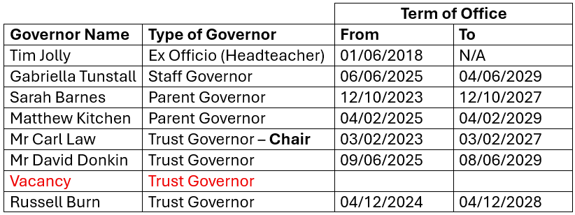 This school has a local governing body (LGB) which is responsible for making day to day decisions on the running of the school. Its power is delegated from trustees of the main multi-academy trust board. It is important that Governors attend meetings and have a presence in school as and when required.