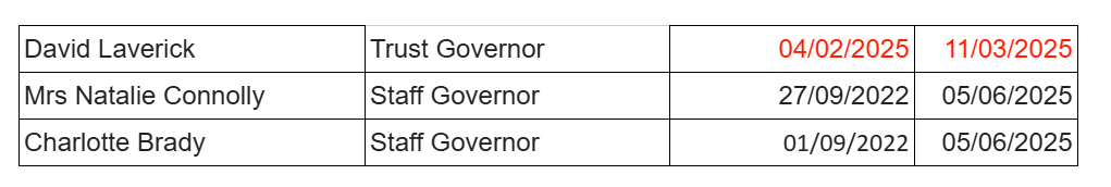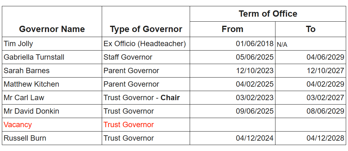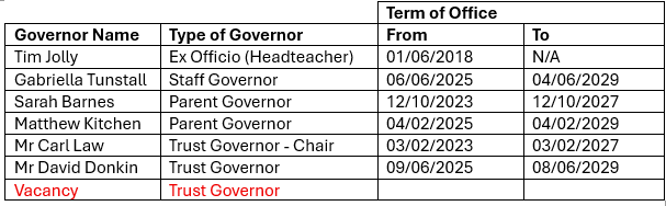 This school has a local governing body (LGB) which is responsible for making day to day decisions on the running of the school. Its power is delegated from trustees of the main multi-academy trust board. It is important that Governors attend meetings and have a presence in school as and when required.